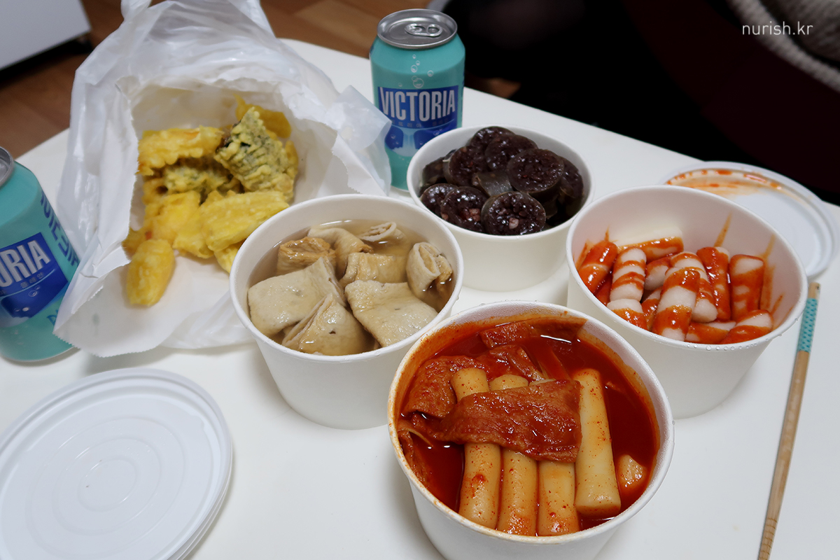 저녁으로 근처 신공주떡볶이에서 떡볶이, 오뎅, 튀김, 순대, 떡튀김을 사왔다. 오랜만에 분식 파티.