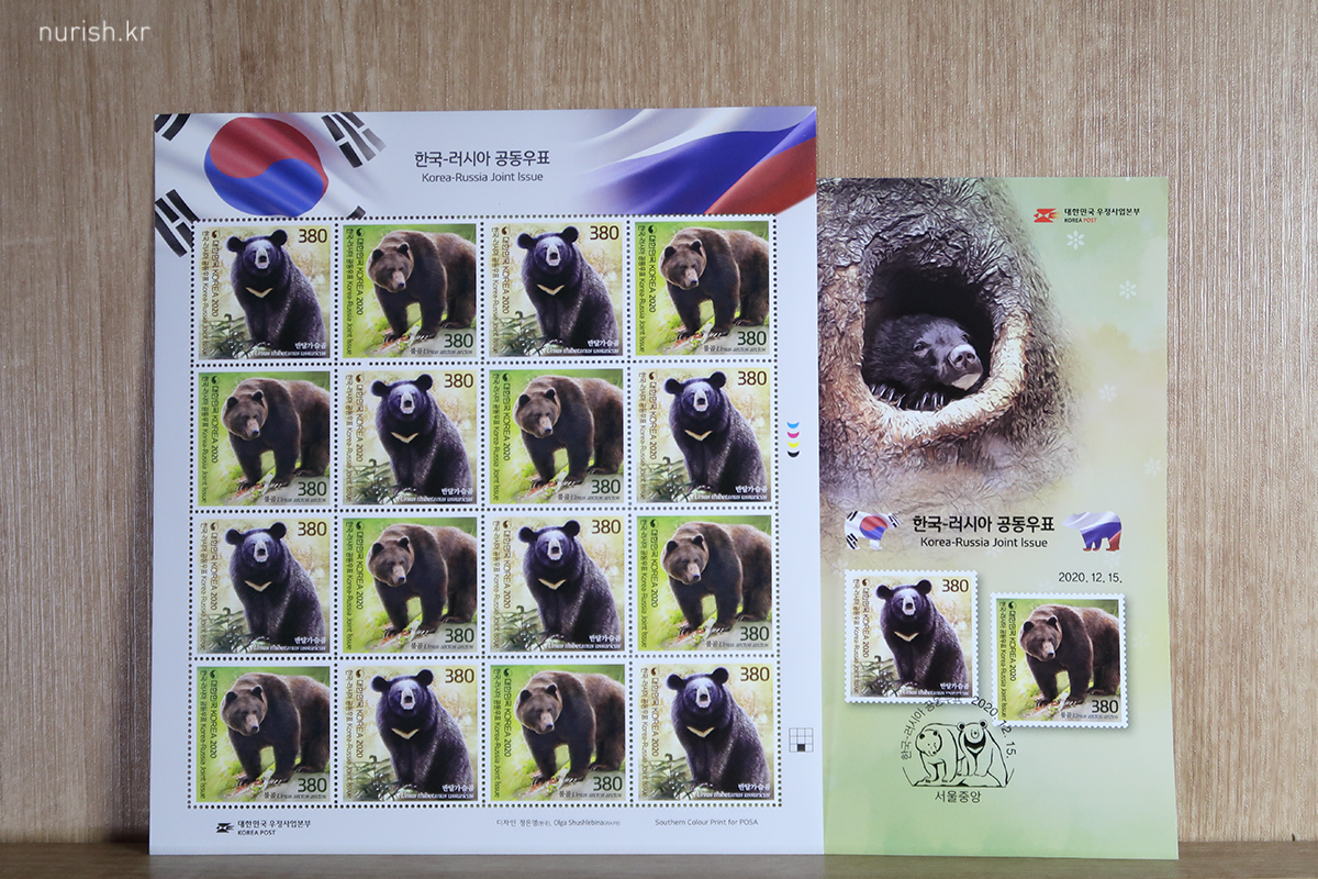 2020년 12월 15일 발행된 한국-러시아 공동우표. 수교 30주년을 맞아 양국에서 발행되는 공동우표이다. 곰 두 마리가 너무 귀엽다.