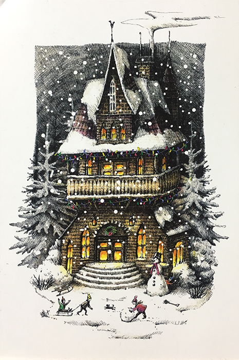 눈이 소복히 쌓인 겨울 풍경 그림 엽서. 순대와 떡볶이를 꼭 먹어 보고 싶은, 한국 영화와 한국 드라마 팬인 분이 보내준 엽서이다.