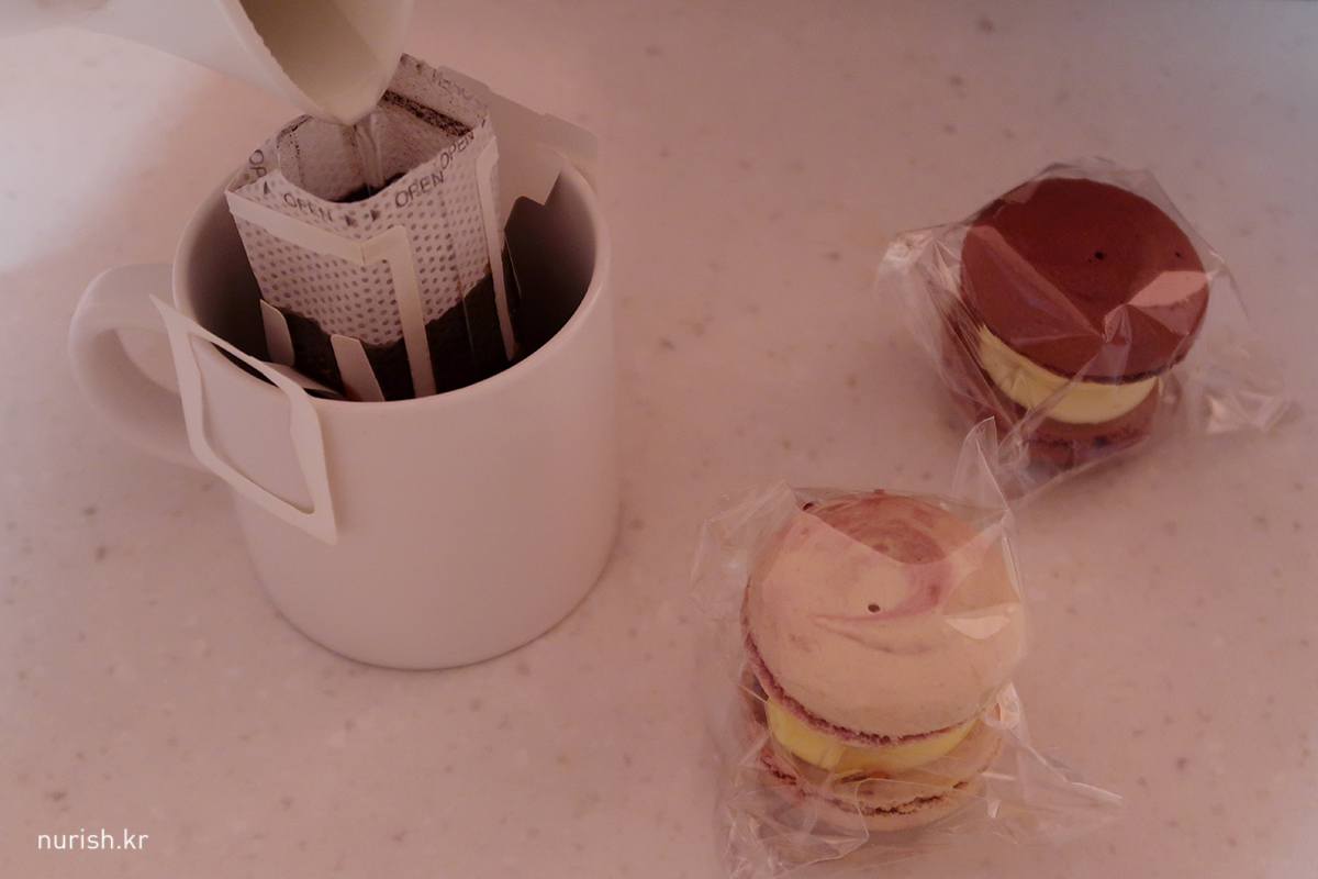 오늘도 출발 전 잠에서 완전히 깨기 위한 커피 한 잔과 뚱카롱.