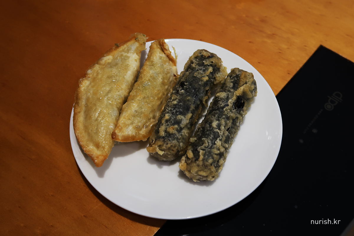 오징어가 다 떨어졌다고 해서 아쉽게도 김말이와 만두 튀김만.