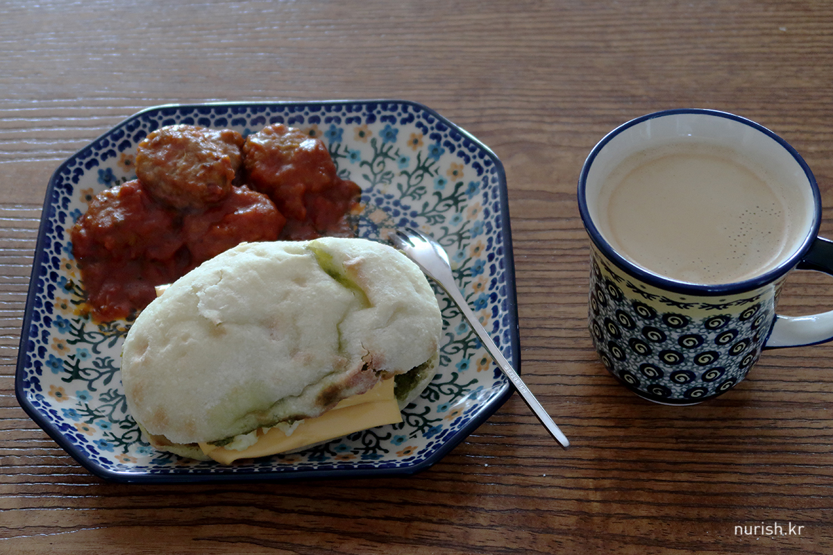 냉동실에 있던 치아바타를 꺼내 샌드위치를 만들었다. 햄이 없어서 어쩔 수 없이 샌드위치에는 바질페스토를 듬뿍 바른 뒤 체다 치즈와 계란 스크램블을 꼈고, 햄 대신 먹을 고기로 냉장고에 있던 미트볼을 데웠다.