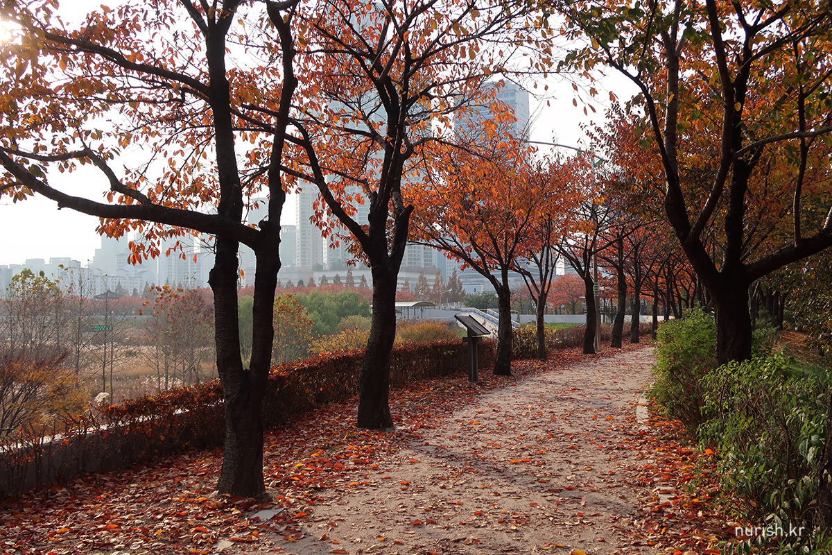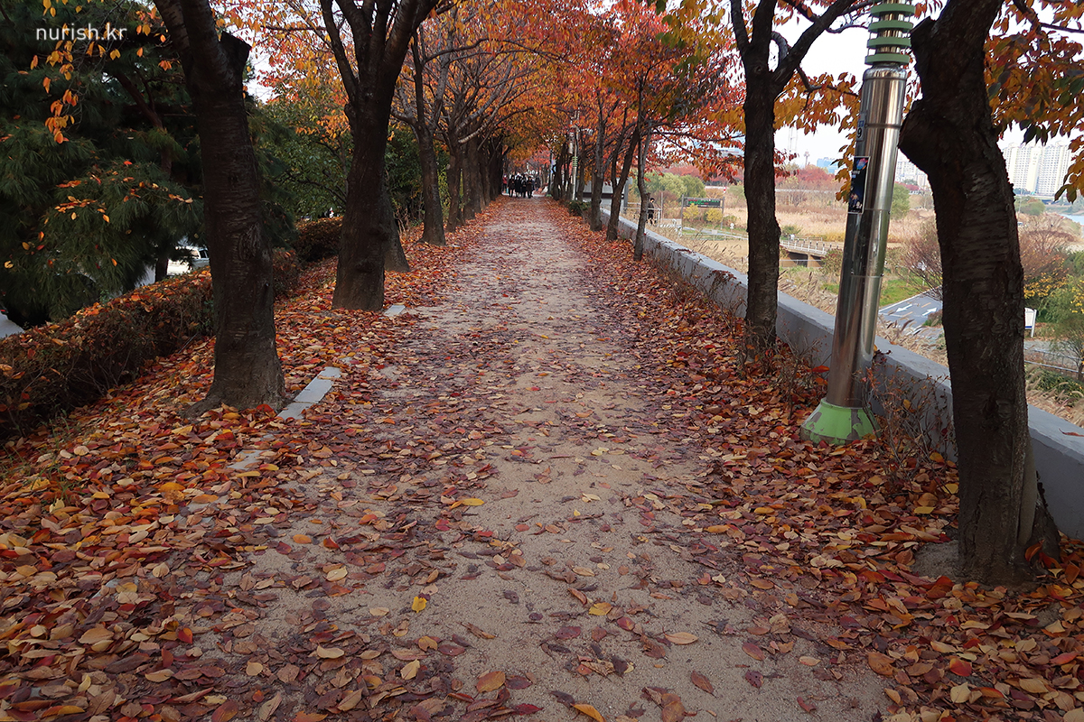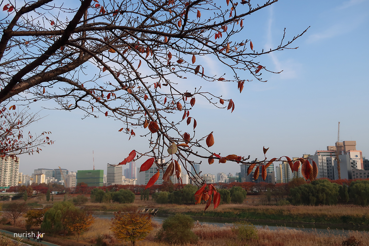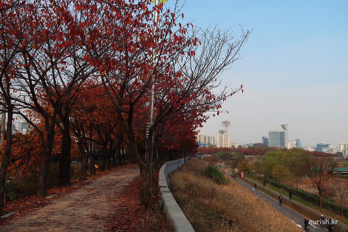 벚나무 이파리들이 빨갛게 물들어 하얀 봄과는 또 다른 절경이다. 예뻐! 날도 따뜻해서인지 자전거 타는 사람도 걷는 사람도 뛰는 사람도 제법 많았다.