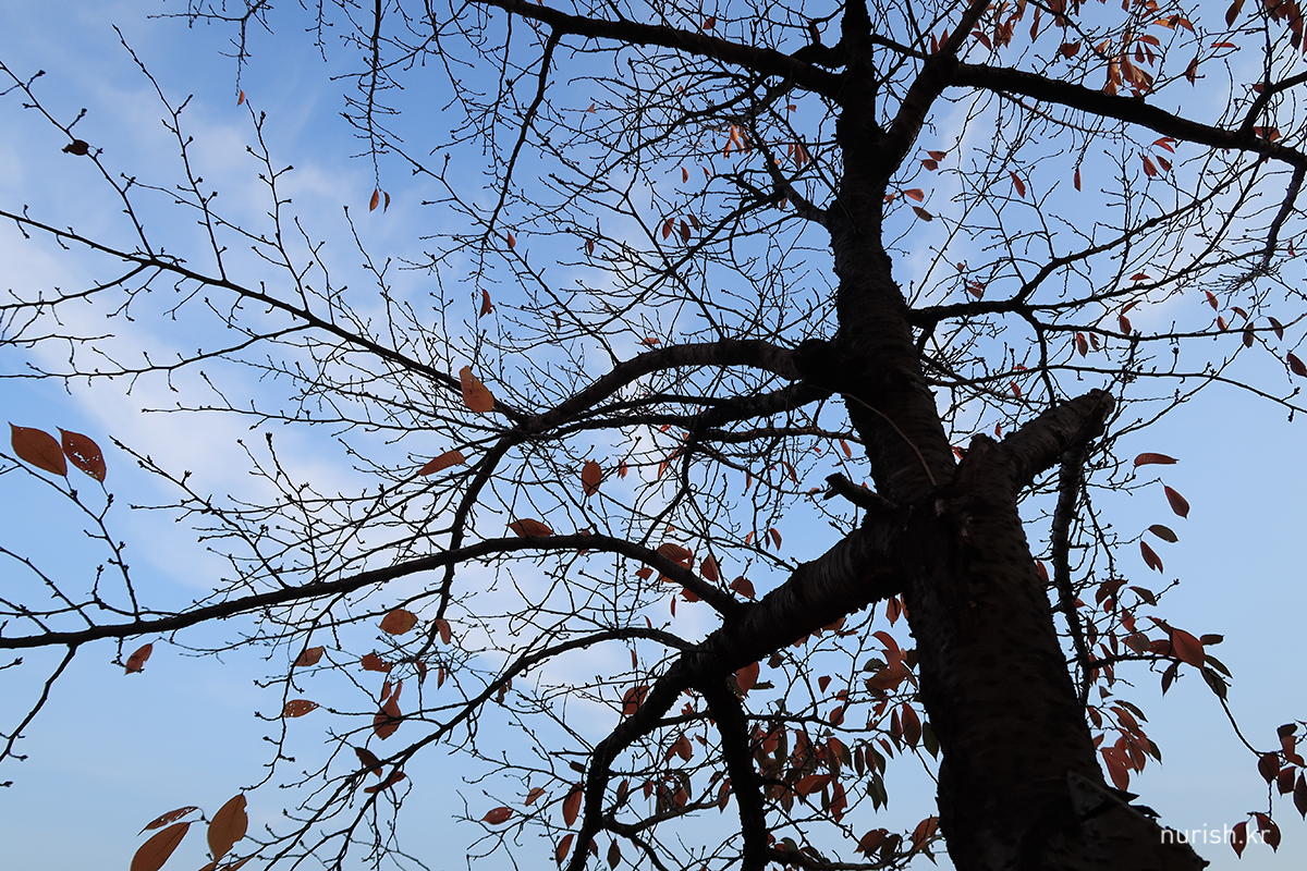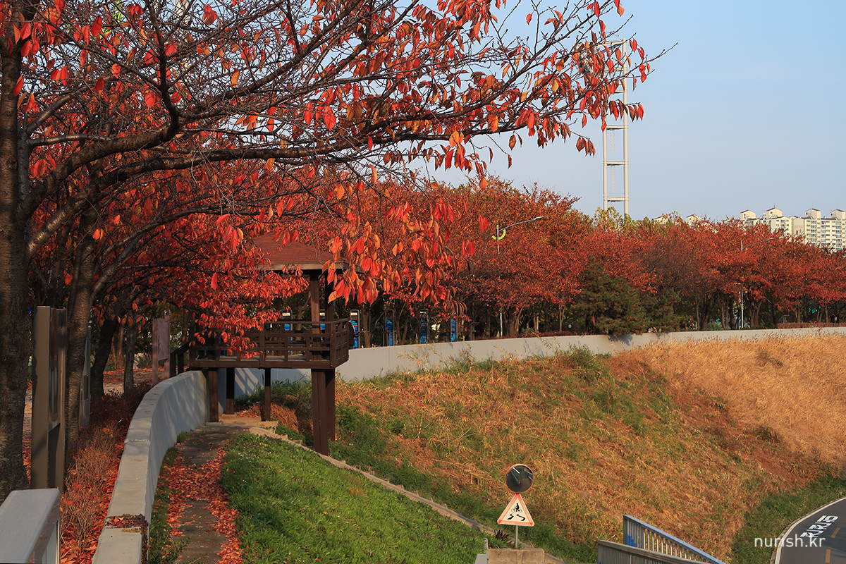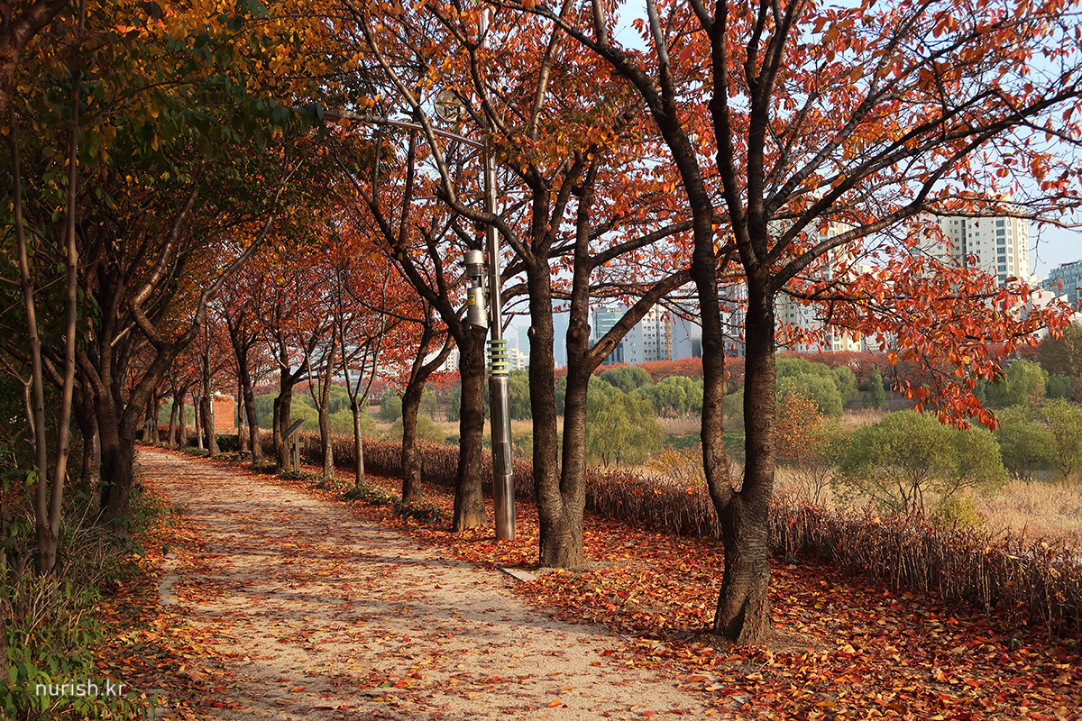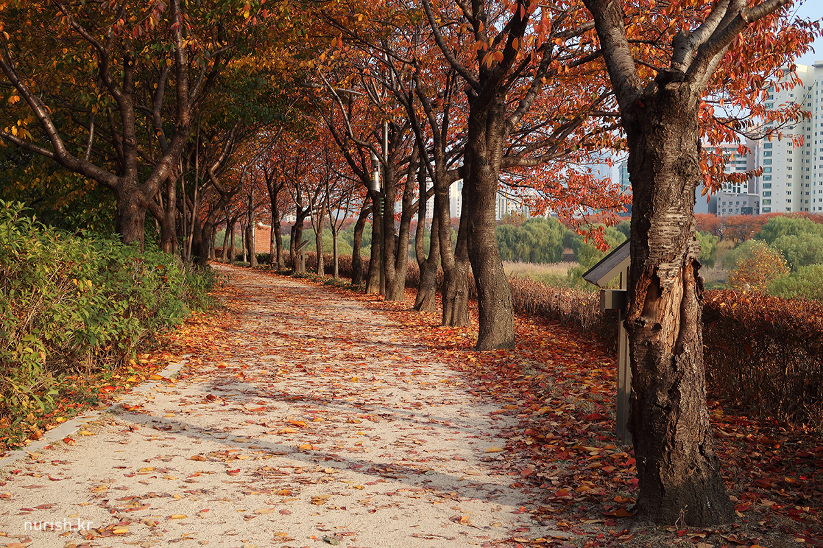 벚나무 이파리들이 빨갛게 물들어 하얀 봄과는 또 다른 절경이다. 예뻐! 날도 따뜻해서인지 자전거 타는 사람도 걷는 사람도 뛰는 사람도 제법 많았다.