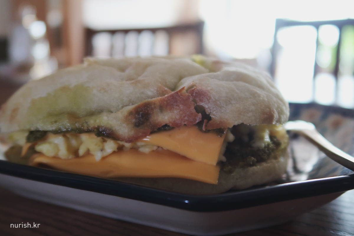 냉동실에 있던 치아바타를 꺼내 샌드위치를 만들었다. 햄이 없어서 어쩔 수 없이 샌드위치에는 바질페스토를 듬뿍 바른 뒤 체다 치즈와 계란 스크램블을 꼈고, 햄 대신 먹을 고기로 냉장고에 있던 미트볼을 데웠다.