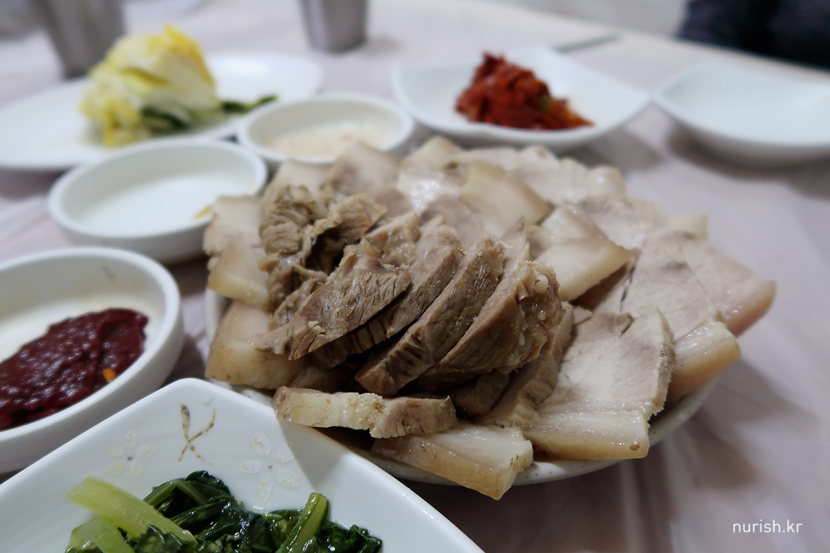 편육이랑 메밀국수 곱배기를 주문했다. 고기와 명태회무침 조합이 진짜 끝내준다. 아침도 안 먹고 양양에서 45분 달려서 온 보람이 있다.