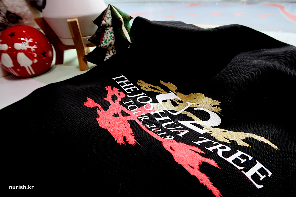 J와 함께 U2 조슈아트리 투어 머천다이즈로 토트백 샀다.