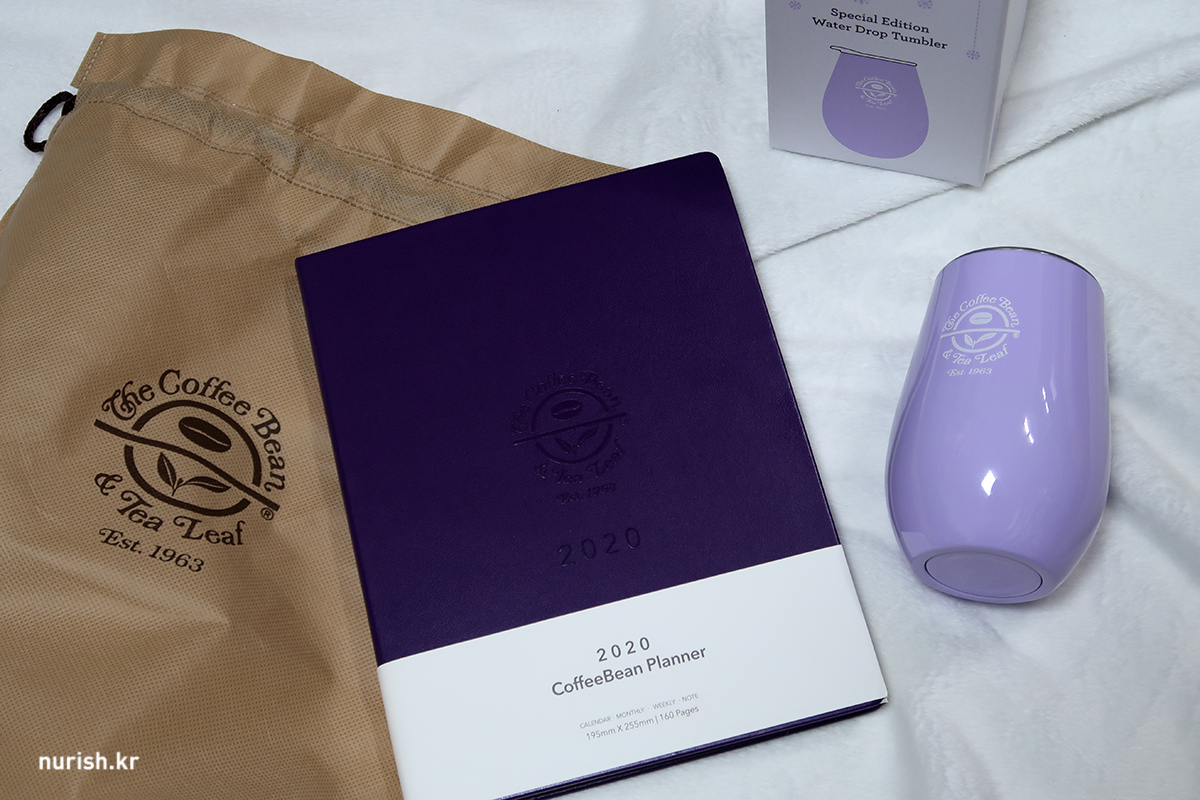 귀여운 워터드롭 텀블러를 준다고 해서 2020년 일기장은 커피빈 플래너로 정했다. 다이어리가 크기도 다양하고 색도 다양하기에 제일 크고 예쁜 보라색으로 결정했다. 텀블러 색깔은 소프트퍼플에 유광.