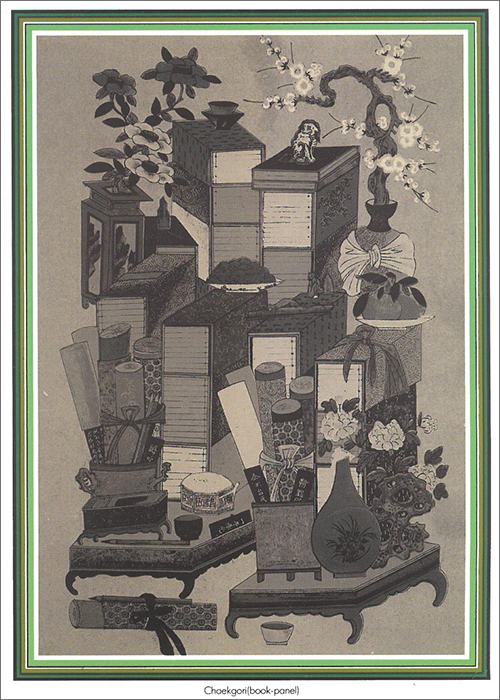 책거리: 책을 중심으로 문구와 길상상징 등을 하나의 화면으로 구성한 그림이다. 책은 높은 벼슬을 뜻하며 문방구는 유교가 지배하는 봉건사회에서 입신양명을 상징하는 것으로서 특히 이 책거리의 상징들에서 강조되는 것은 과거에 급제하여 부귀와 장수를 누리라는 송축의 의미이다.