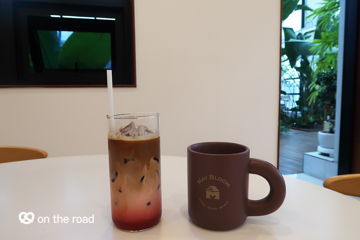 카페의 시그니처 메뉴인 아이스 메이블룸 라떼와 따뜻한 아메리카노. 메이블룸 라떼에는 화이트 초콜릿이 섞여 있다.