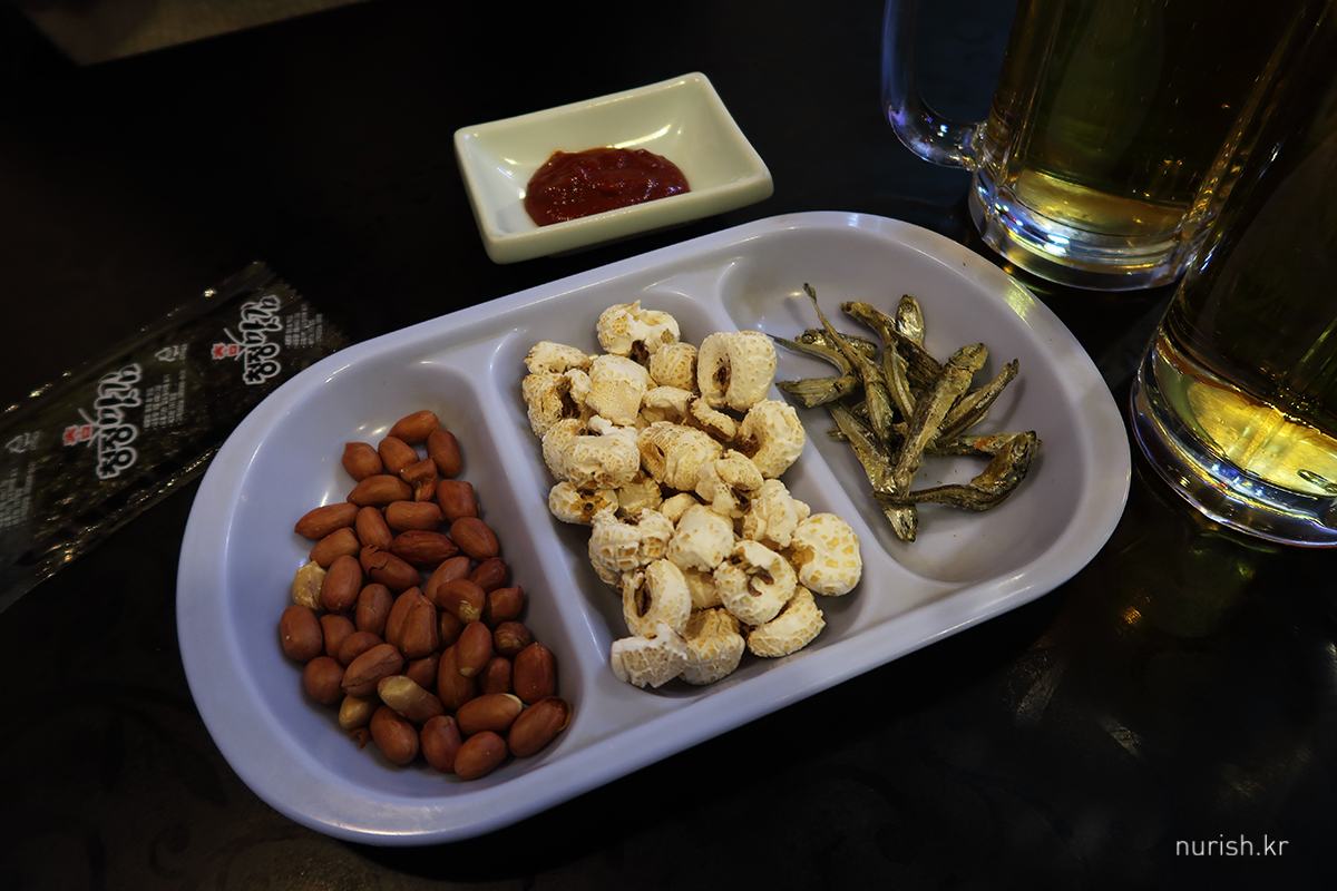 급 번개 치맥하러 합정역 그리운금강산치킨&호프에 왔다. 옛날식 기본 안주들과