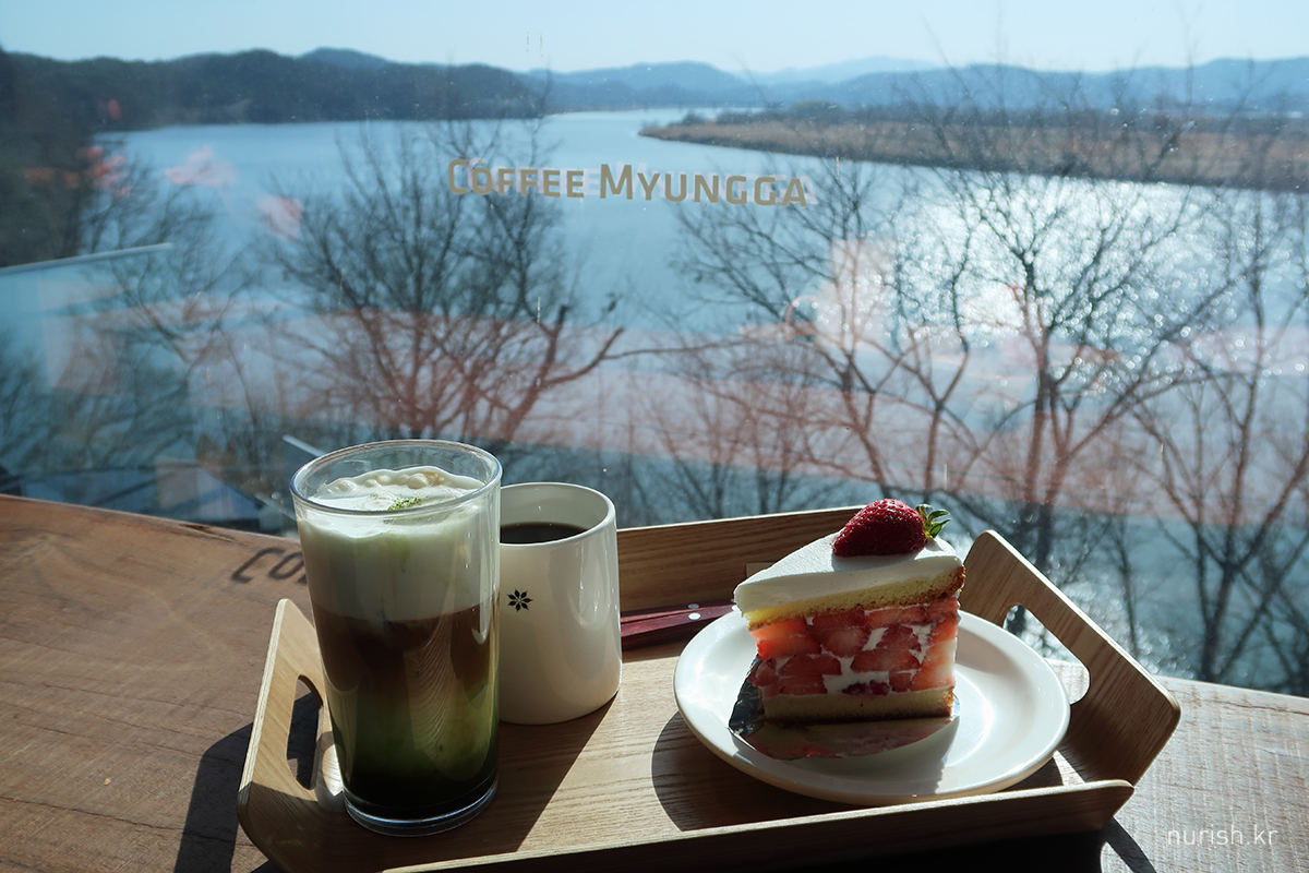 시내는 너무 복잡하니까 점심만 먹고 외곽으로 나왔다. 낙동강이 유유히 흘러가는 풍경을 바라보며 쉴 수 있는 달성군 구지면에 있는 커피 명가. 말차 명가치노와 아메리카노, 딸기케이크.