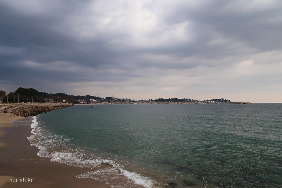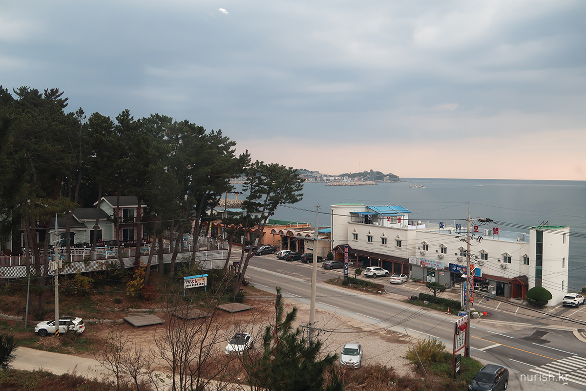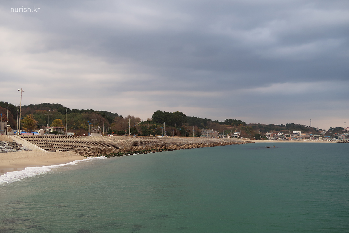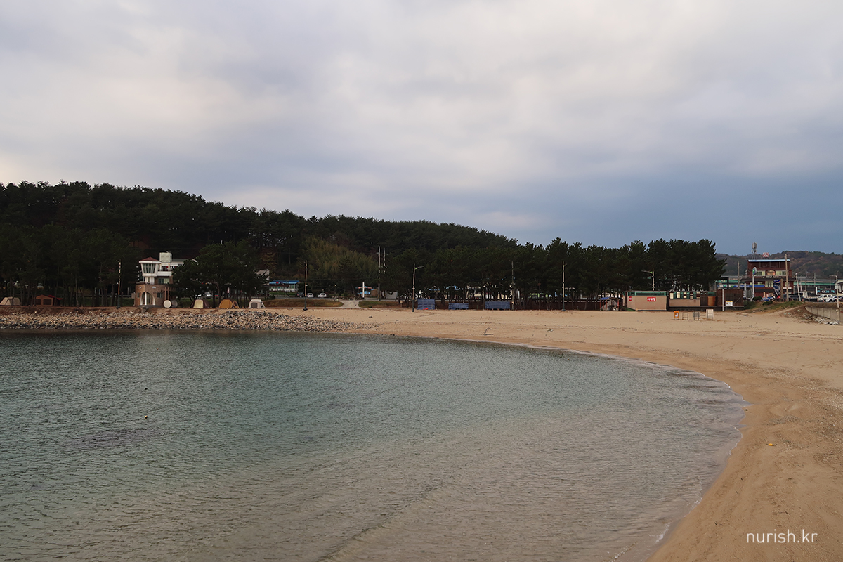 체크아웃하고 잠깐 들른 봉평해수욕장, 전날밤 걸어왔을 때는 캄캄해서 아무것도 안 보였는데 이런 풍경이었다.