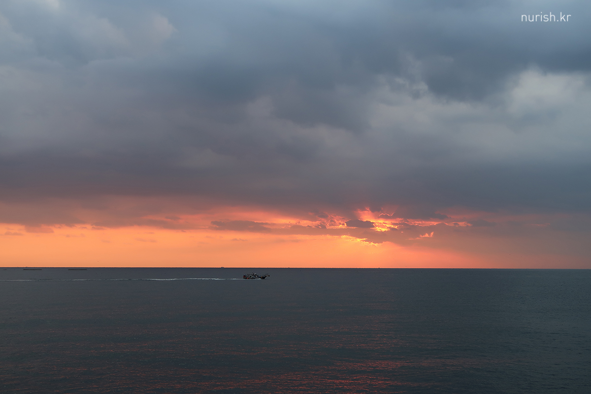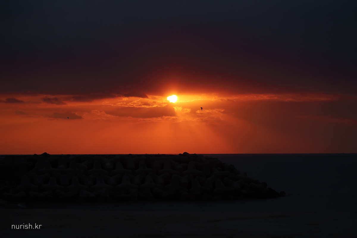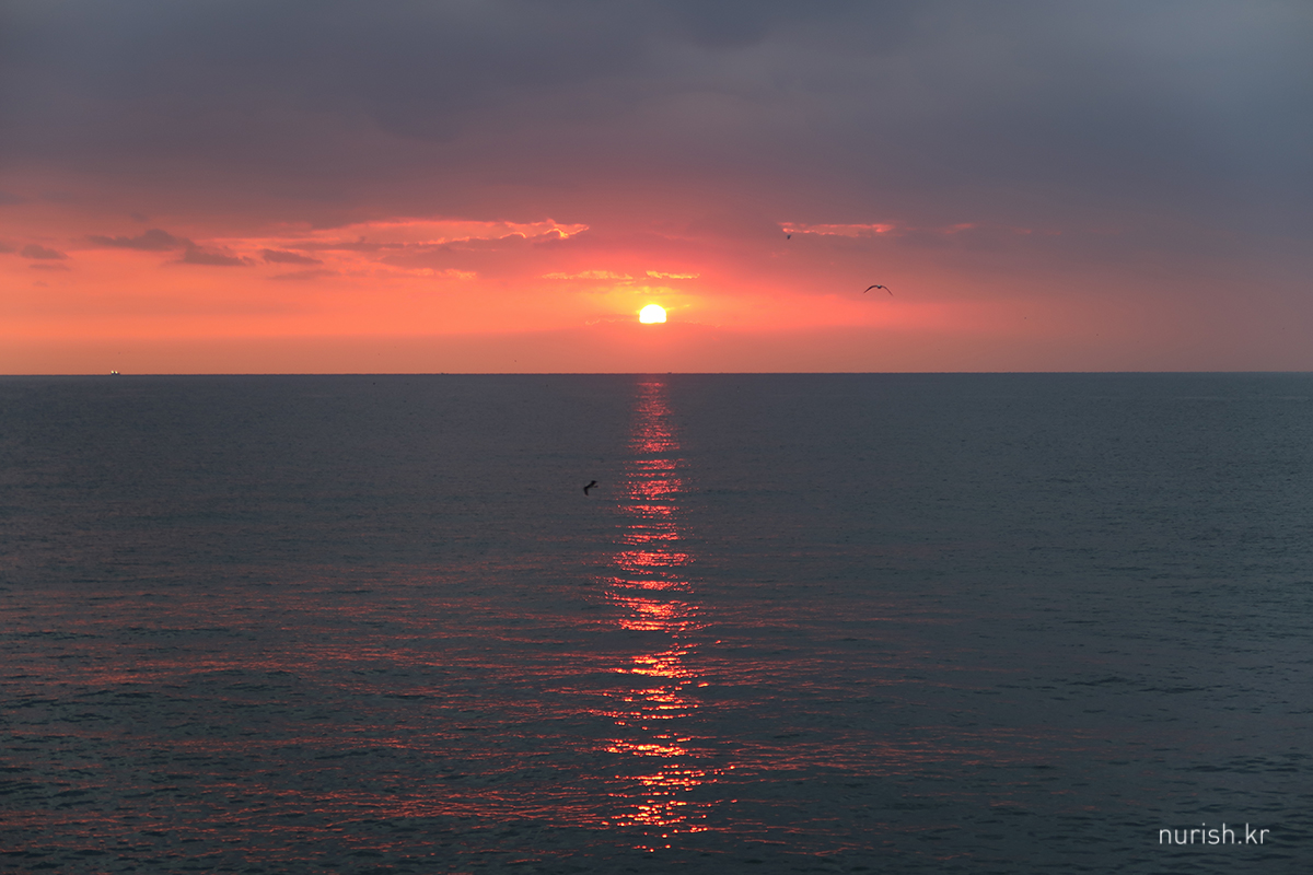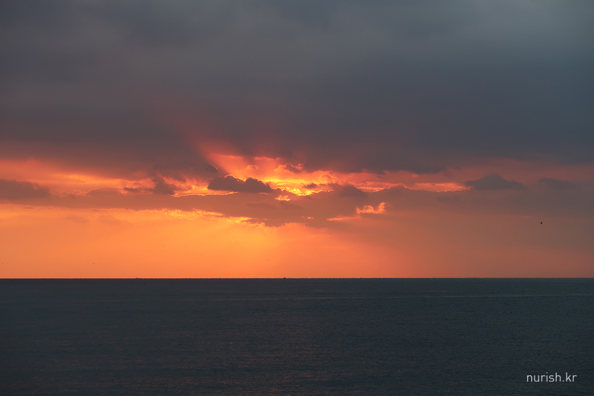 동해에 왔으니 해돋이를 봐야겠다고 시간 맞추어 숙소 앞 바닷가로 나왔는데,구름이 잔뜩 깔렸다.