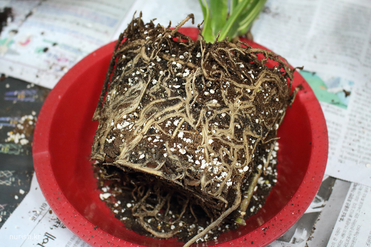 엎었다. 뿌리가 화분 가득 차서 꺼내기도 힘들었다. 실뿌리도 많고 통통해 보이는 뿌리도 많아서 기분이 좋다. 잘 자라고 있구나. 기특한 녀석.