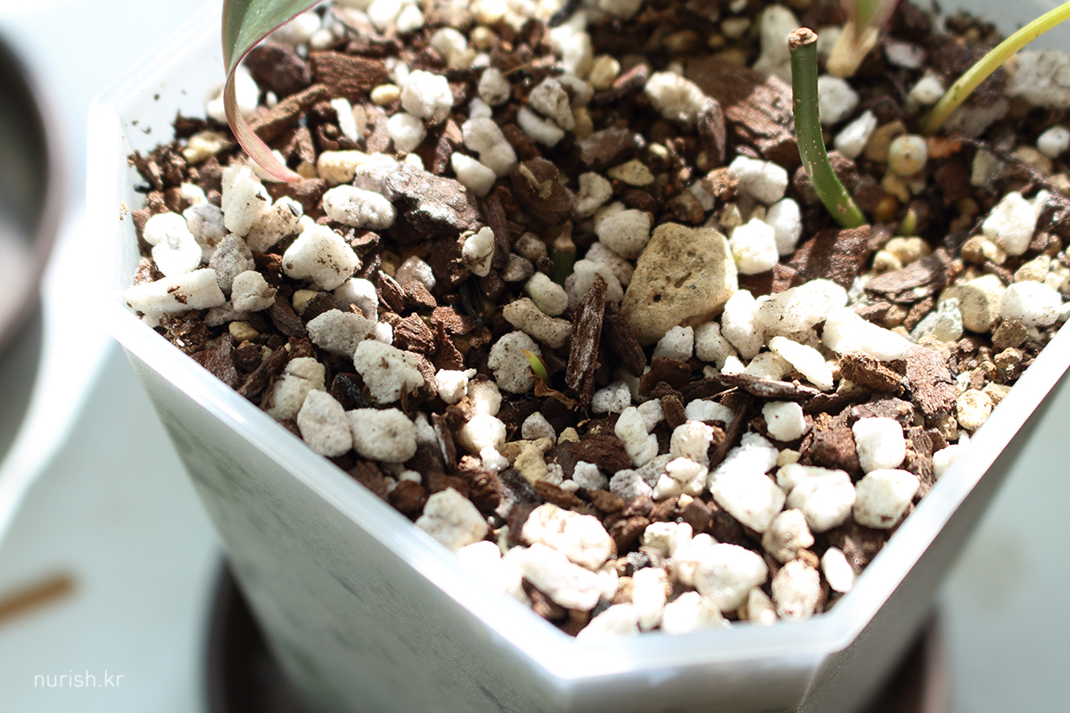 잎 크기 때문에 여전히 화분이 좀 작아 보이기는 하지만 21cm 롱화분에 분갈이 완료.