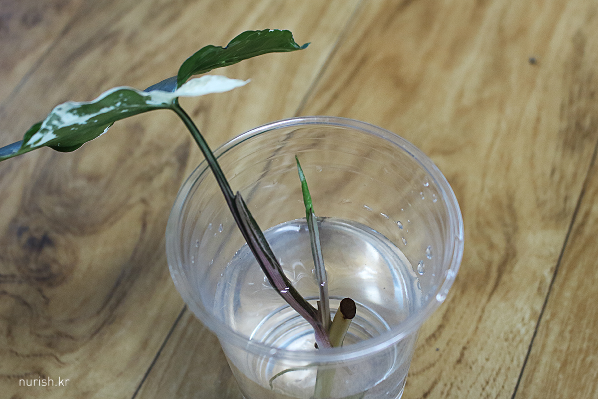 뿌리 잘 나고 있다. 탑삽수의 가장 최신 잎에 있던 돌돌이 새순이 까맣게 녹아버려서 잎 하나 잘라 버렸다. ㅠㅠ
