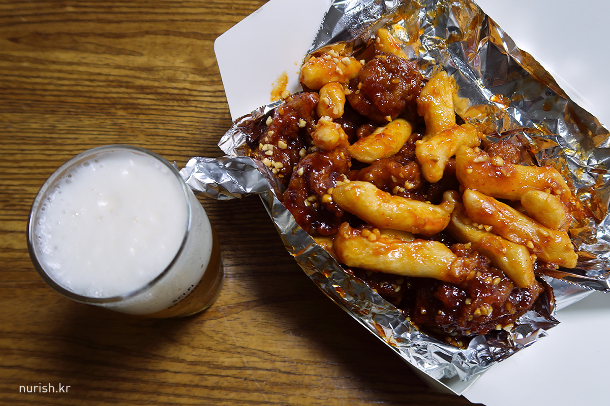 퇴근길에 포장해 온 닭강정과 맥주 한 캔. 회사에서 좀 짜증나는 일이 있었는데 맵고 기름진 음식을 먹으니 마음이 좀 풀린다.