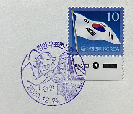 봉투 안에 조그만 봉투가 하나 더 들어 있었는데, 놀랍게도 10원짜리 태극기 우표와 작년에 천안에서 열린 우표전시회 코로나19 퇴치기원 기념인이 찍혀 있었다. 신기하다. ㅋㅋㅋ 천안에서 우표전시회를 하는 줄도 몰랐네.