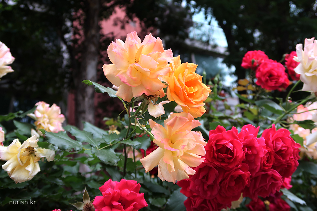 가려던 카페가 오늘은 일곱 시에 문을 닫는다고 해서 연트럴파크 쪽으로 나왔다. 연트럴파크 옆에 있는 아파트 화단에 색색깔 장미가 활짝.