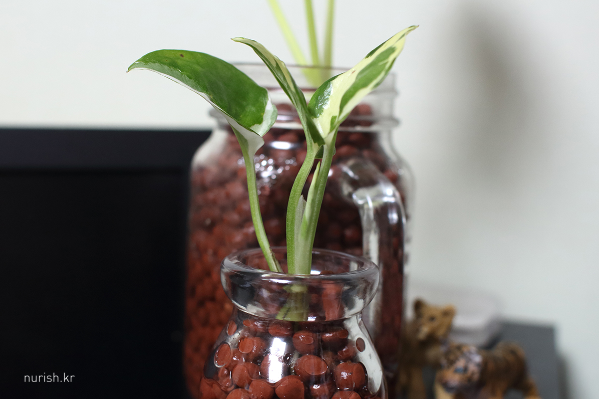 저 뒤에 있는 지구2-랜터니는 아직 잎은 별 변화가 없는데, 황토볼 씻으려고 한번 꺼내니 다행히도 뿌리가 열심히 자라는 중이었다.