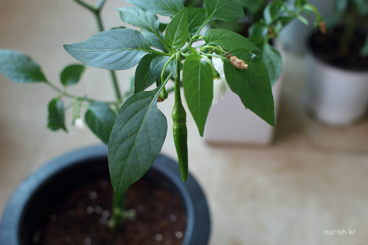 희망이 별로 없는 줄 알았는데 고추 뙇!!!!! 신기할세. 그런데 관찰하다 보니 잎이 총체인지 뭔지 때문에 상태가 안 좋아 보여서 이상한 애들 다 뜯어 버렸다. 제발 벌레 끼지 말고 건강하렴ㅠㅠ