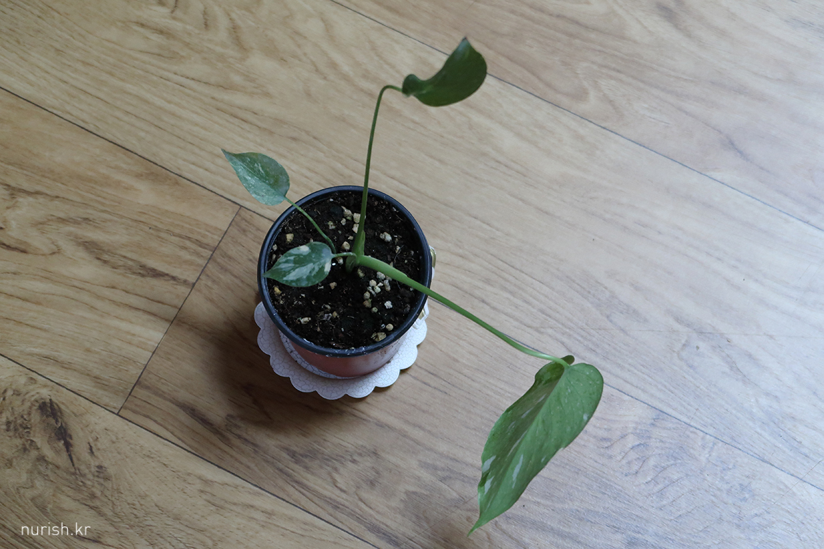 6월 9일 주문 성공, 택배 파업 때문에 2주일 정도 기다려서 6월 22일에나 수령한 담티수족관 출신 무늬 몬스테라. 택배 포장 뜯고 진짜 깜짝 놀랬던 엉망진창 수형 ㅋㅋㅋㅋㅋ 심지어 웃자라서 콩나물이 요기 있네. 그래도 (내 기준) 거금을 주고 산 이 녀석을 죽일 수 없다는 일념 하에 식물 카페 가입해서 어떻게 키울지 공부도 하고 본격적으로 식집사의 길을 걷는다.