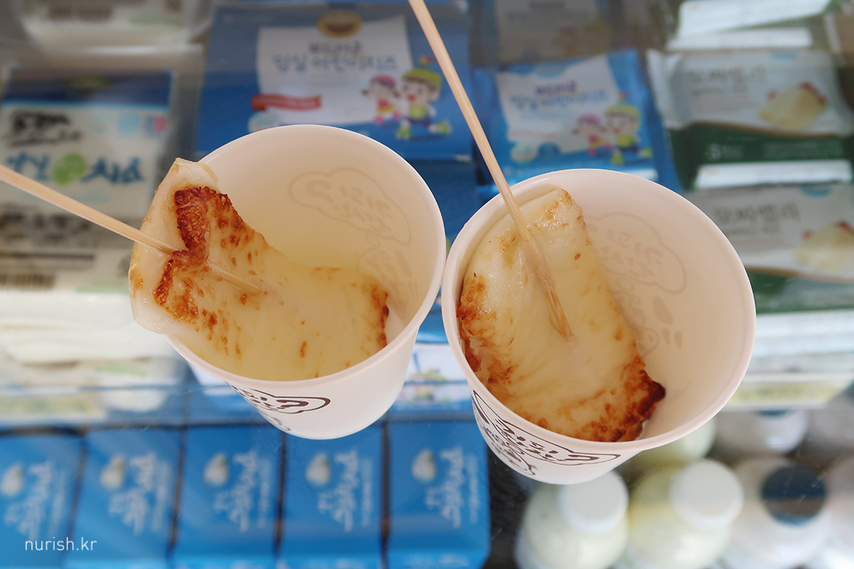 임실 이전에 망향 휴게소를 들렀는데 핫바를 먹고 싶었지만 시간이 일러 판매가 불가능하다는 말을 듣고, 다시 달려 달려 들른 임실 오수휴게소. 임실에 왔으니 치즈를 먹어야 한다며 구운 치즈를 입에 넣었는데 아주 살살 녹는다. 역시 맛있어. ㅠㅠ