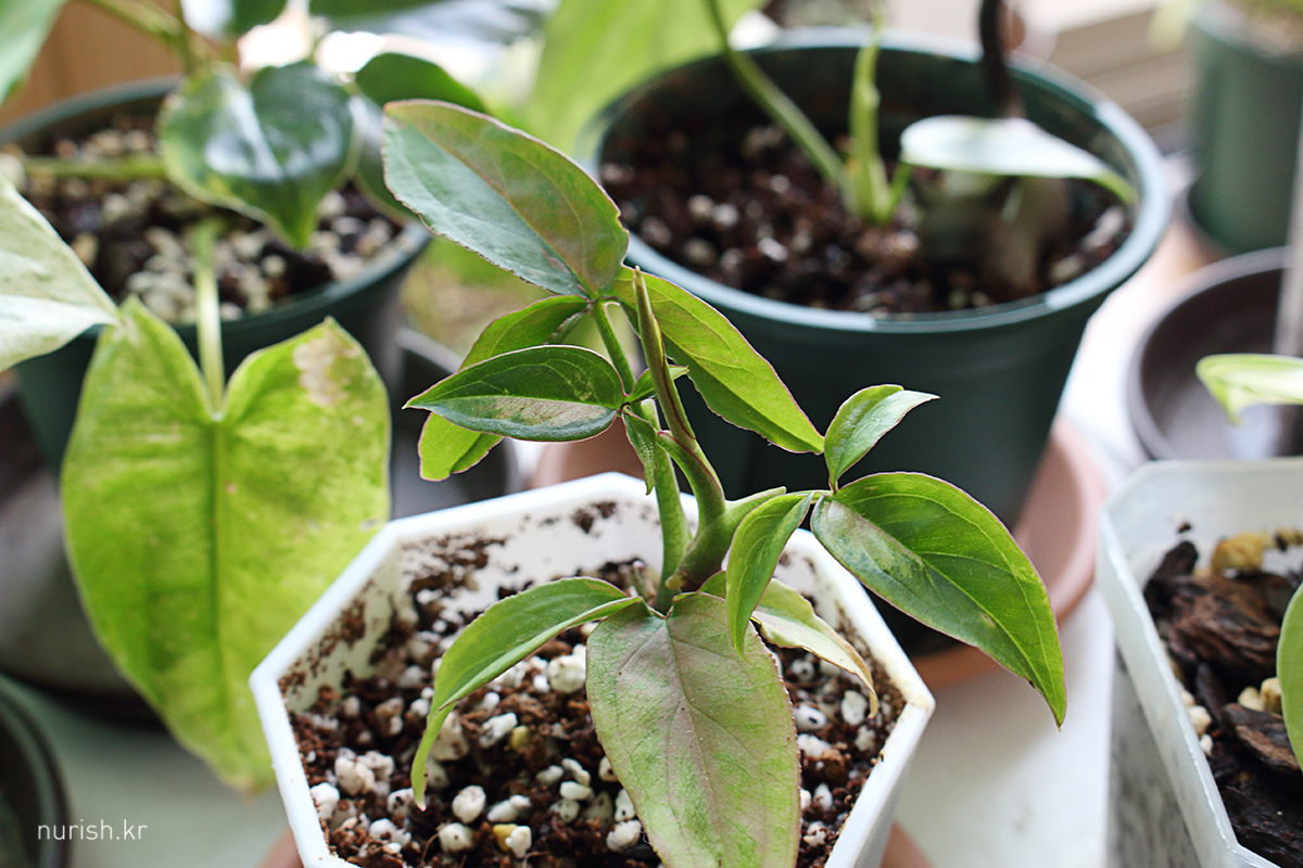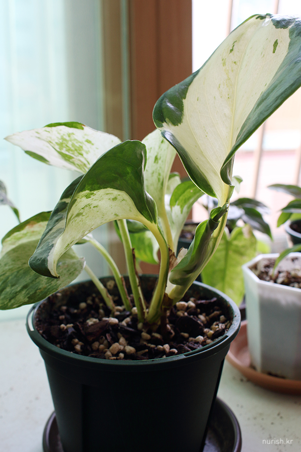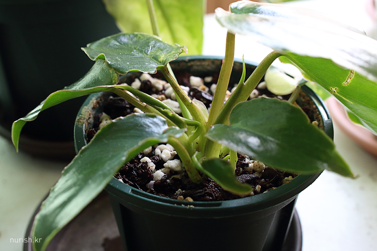 무늬가 아예 없을까봐 걱정했는데 그래도 산반무늬랑 흰무늬 좀 묻히고 나와준 새잎. 잎 크기가 순서대로 차근차근 커져서 귀엽고 예쁘다. 삽수잎은 잘라 버리고 싶음 ㅋㅋㅋ