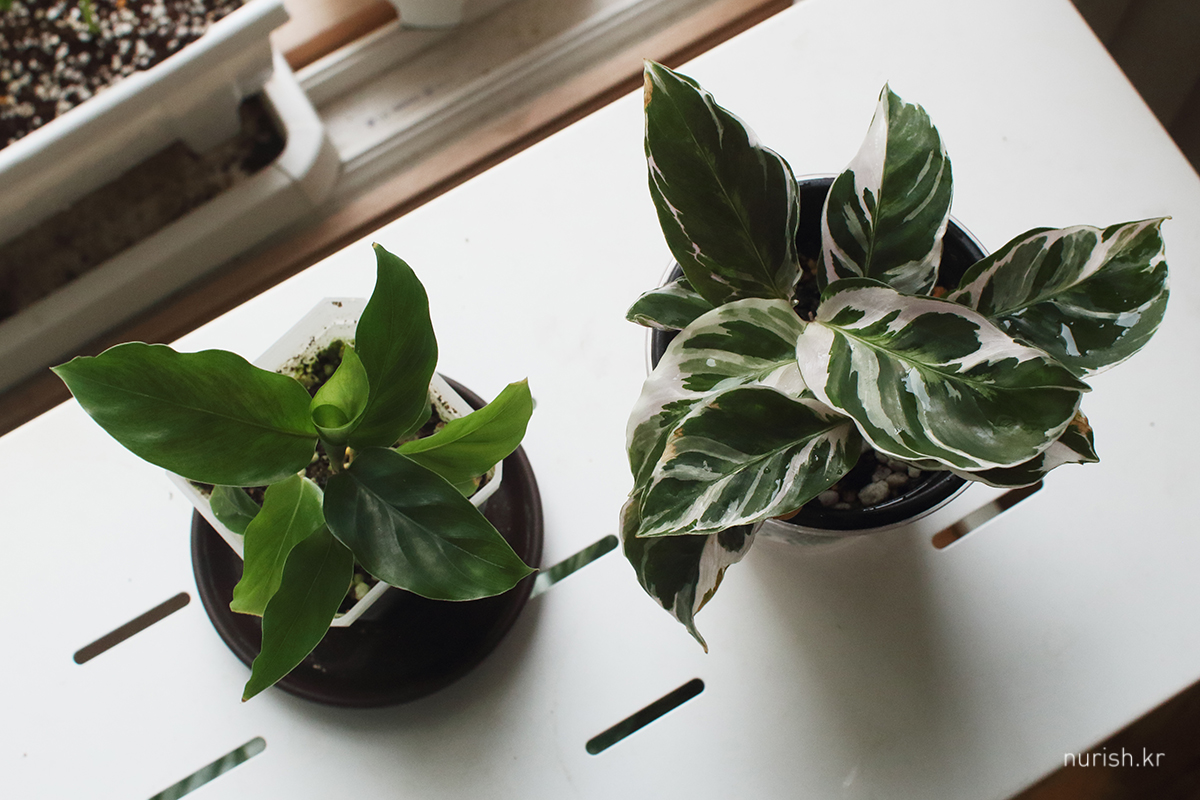 칼라데아 퓨전화이트(Calathea 'White Fusion')와 퓨화 친구 칼라데아 퓨전옐로우(Calathea 'Yellow Fusion')