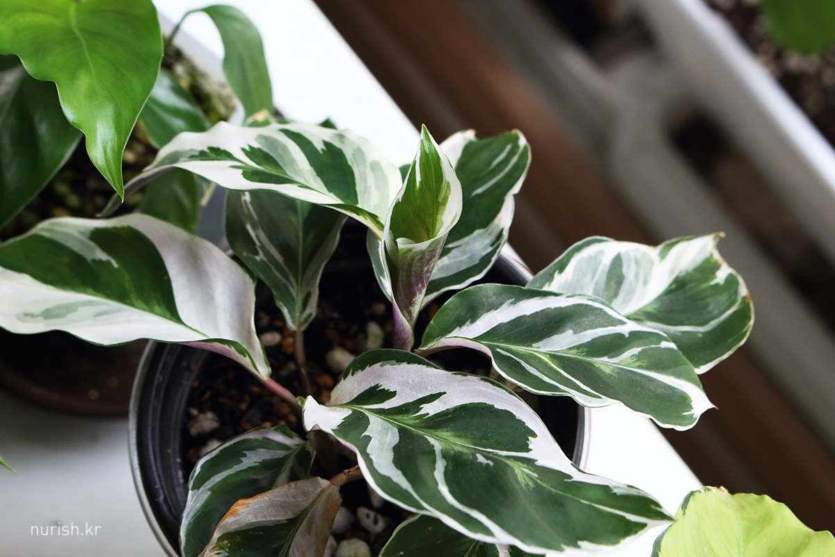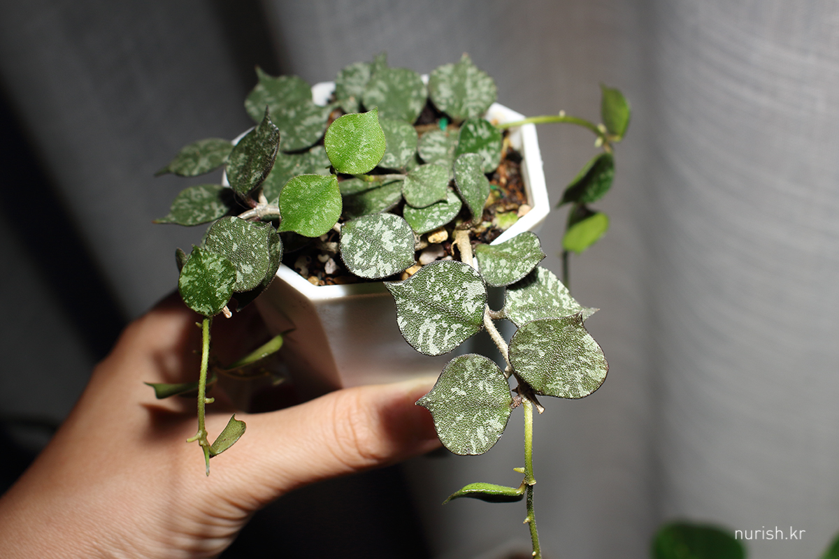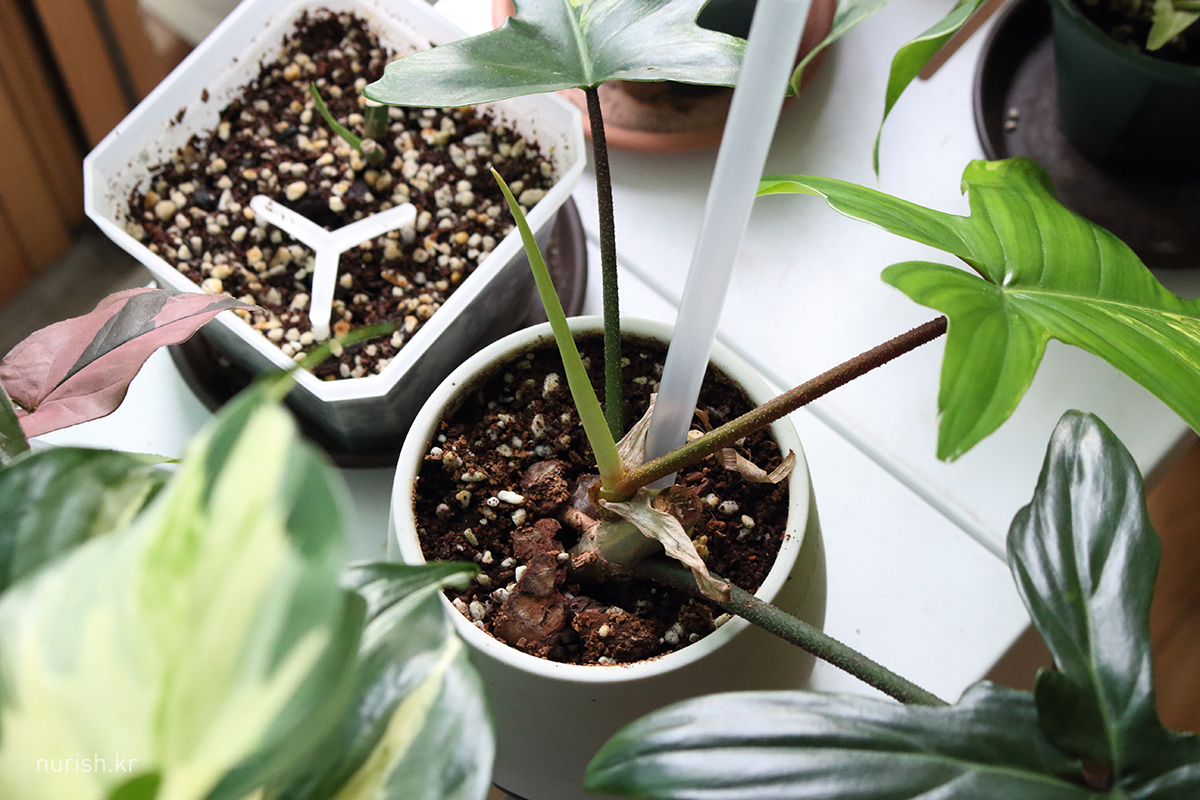 좁은 투명슬릿분이었더니 너무 불안한 과분수로 자라나서 15cm 넓은 플분으로 이사했다. 아랫쪽 작은 잎들 흙에 파묻힐 거 같아서 정리 좀 했더니 갑자기 휑해졌네.