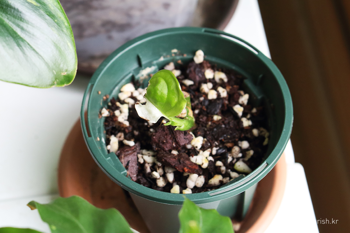 순화 끝! 보름만에 펴진 쬐끄만 반반 떡잎 ㅋㅋ 여름 햇빛이 셌는지 끝이 좀 타서 아쉽 ㅜㅜ 성질 급한 아단이 아니랄까봐 그새 새잎 올라오는 중, 이번엔 잎이 크겠지. 어떤 무늬를 갖고 있으려나.