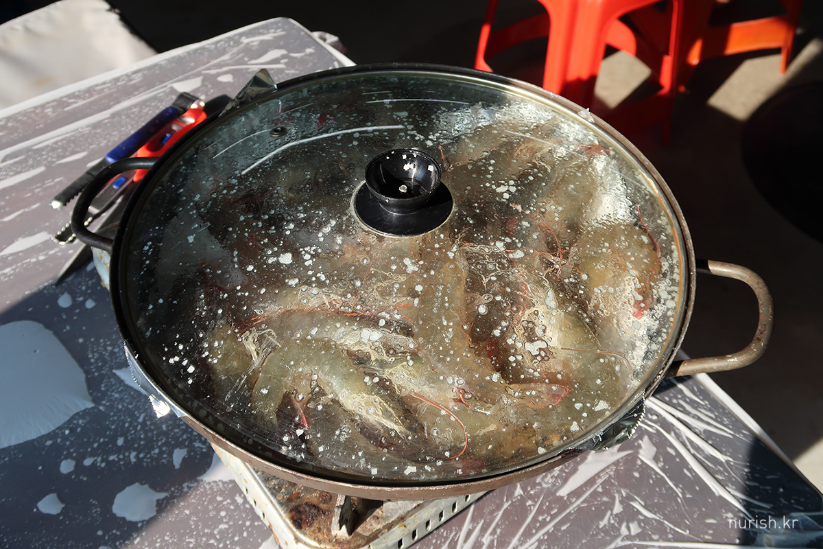 새우는 아주 싱싱하기 때문에 직원 분께서 직접 프라이팬에 넣어주신다.