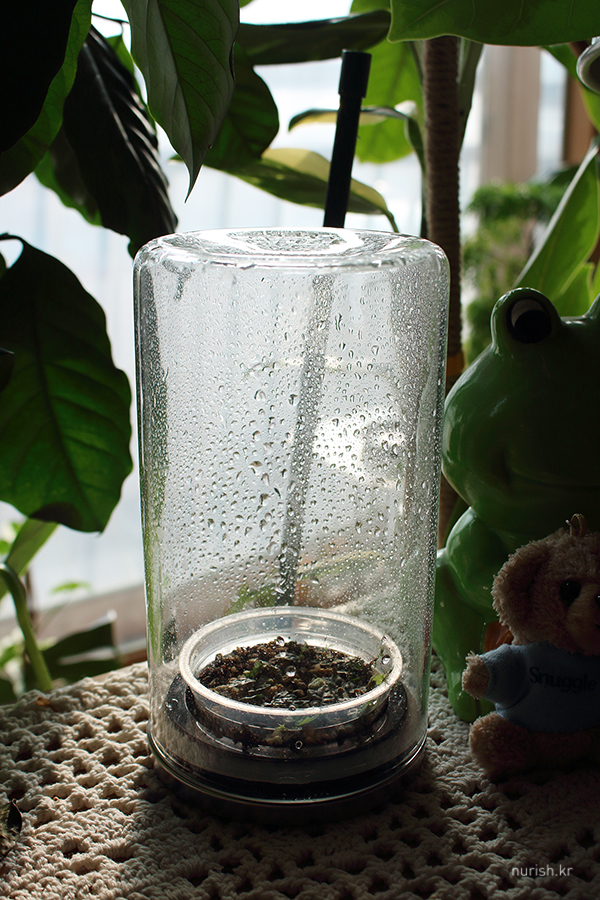 거꾸로 놓고 미니 온실로 사용 중인 다이소 내열유리 저장용기 ㅋㅋ 자리 차지도 많이 하지 않아서 꽤 요긴하게 쓰이는 중이다.
