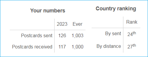 내가 엽서를 보낸 25개 나라 중, 제일 많이 보낸 나라는 독일, 22개 나라 중, 내가 엽서를 제일 많이 받은 나라는 미국 :)