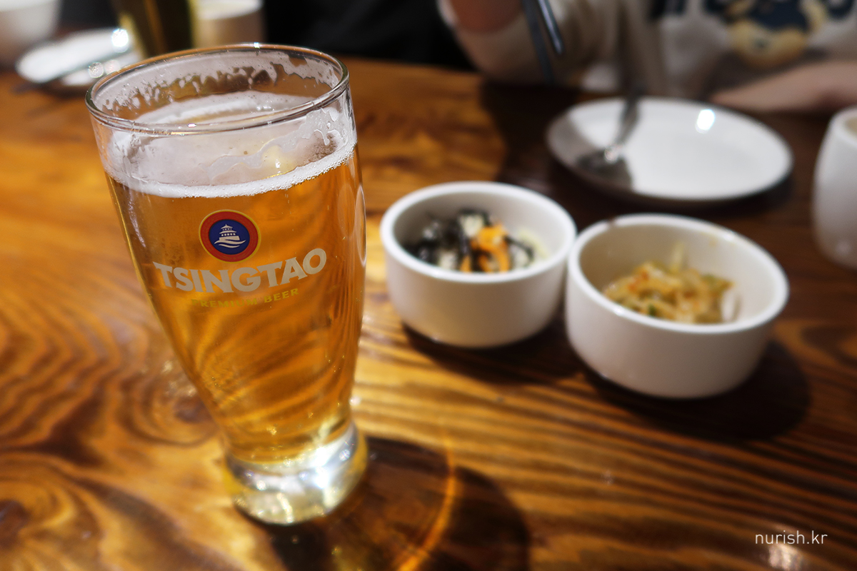 칭따오 생맥주, 한 입 마시고 사진 찍어서 거품이 없어졌다. ㅋㅋ