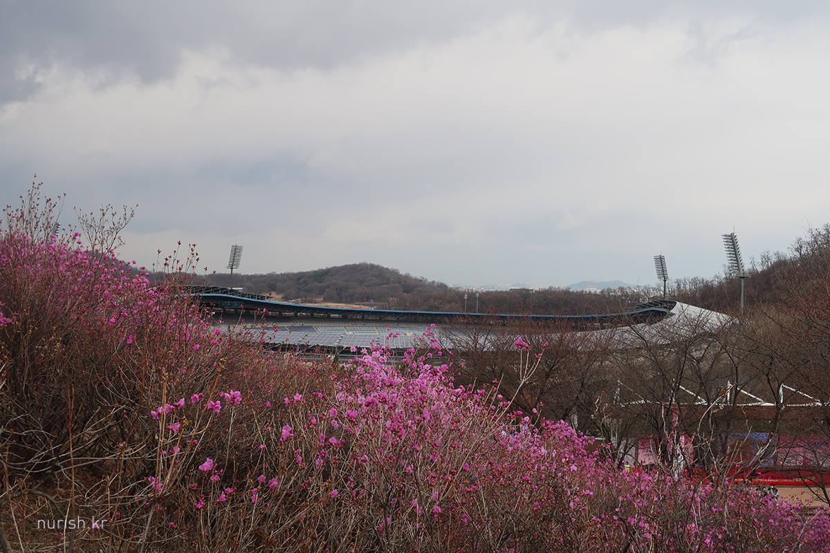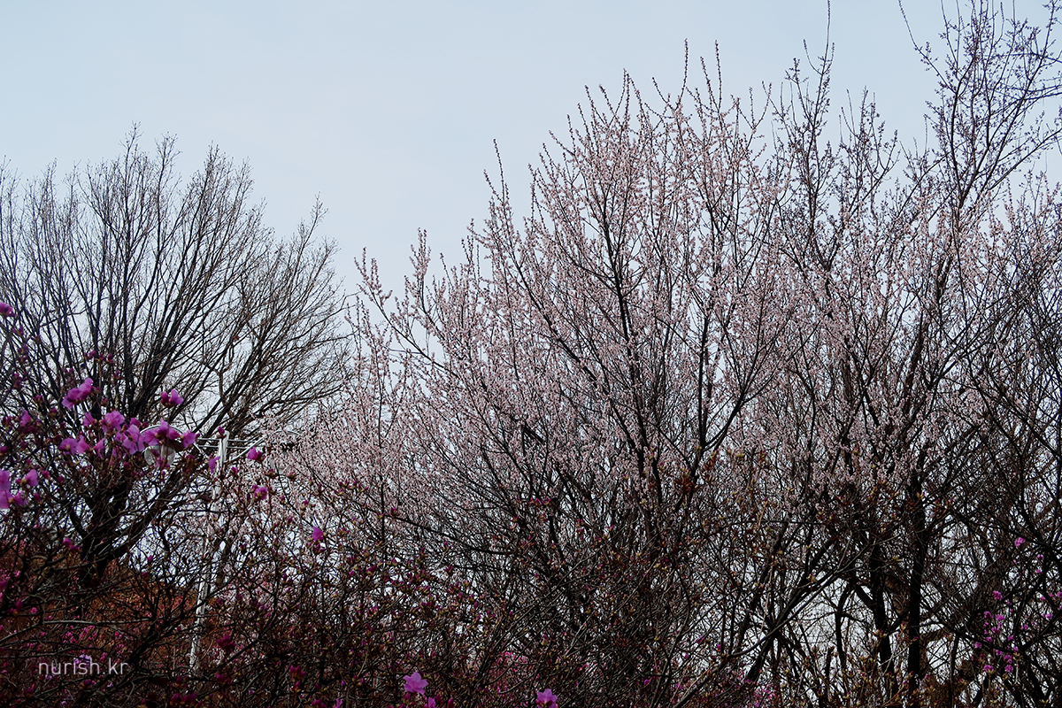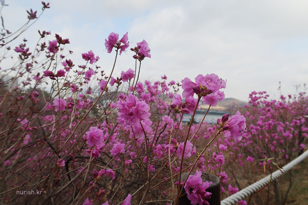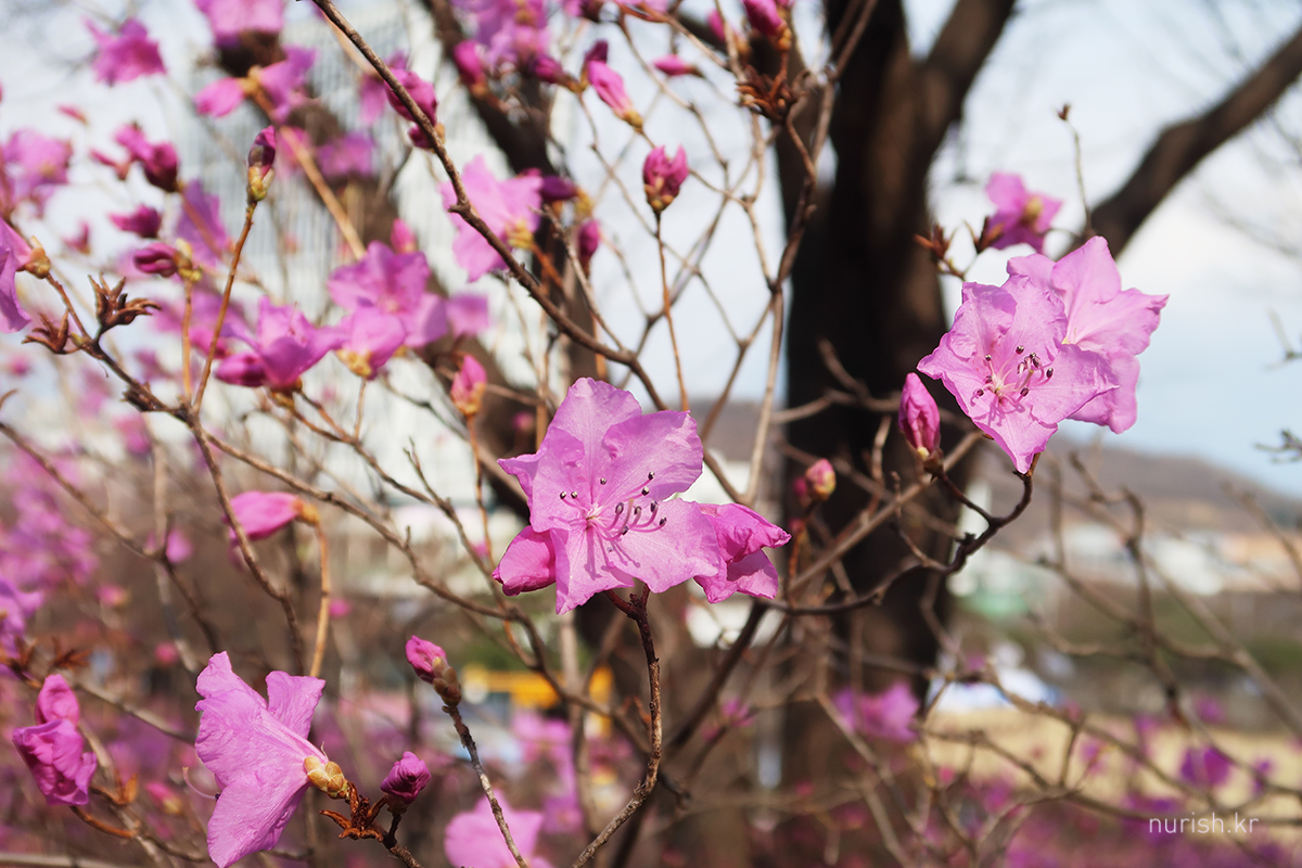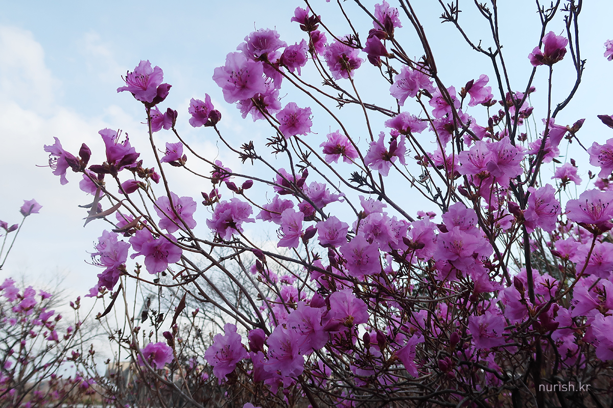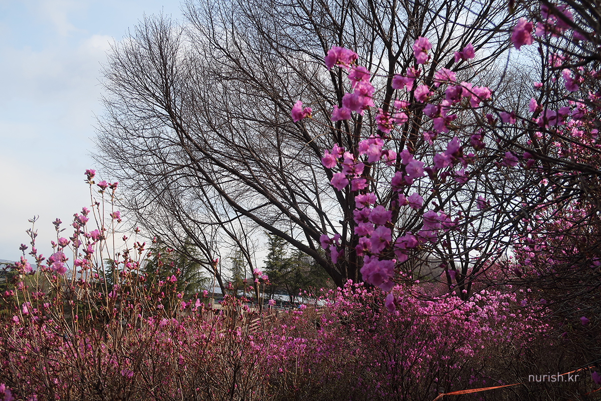집 근처 부천에 진달래가 활짝 피었다는 소식을 듣고 달려왔다. 개화는 한 60% 정도 된 것 같은데, 주말 동안 눈보라에 몹시 쌀쌀하지만, 다음 주면 만개일 듯하다.